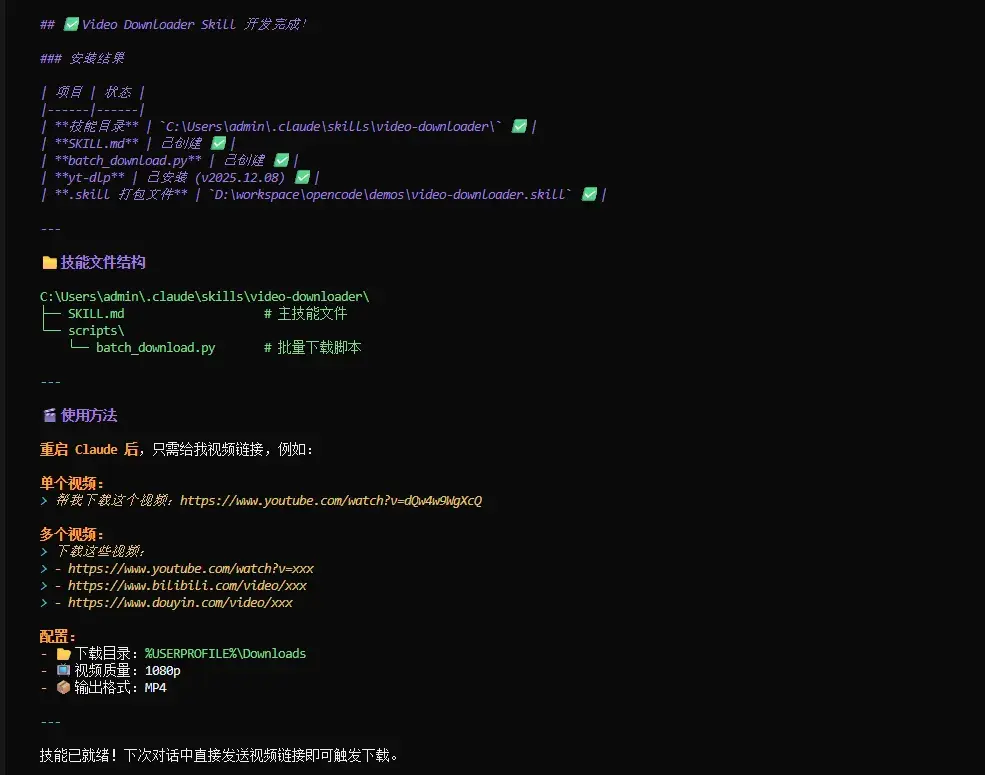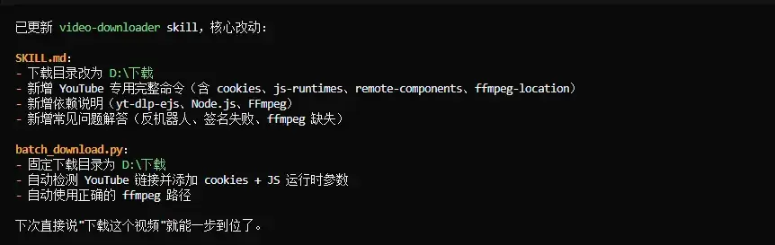 过了一会,大概2分钟以后,这个基于yt-dlp的视频下载Skill,就开发完成了。