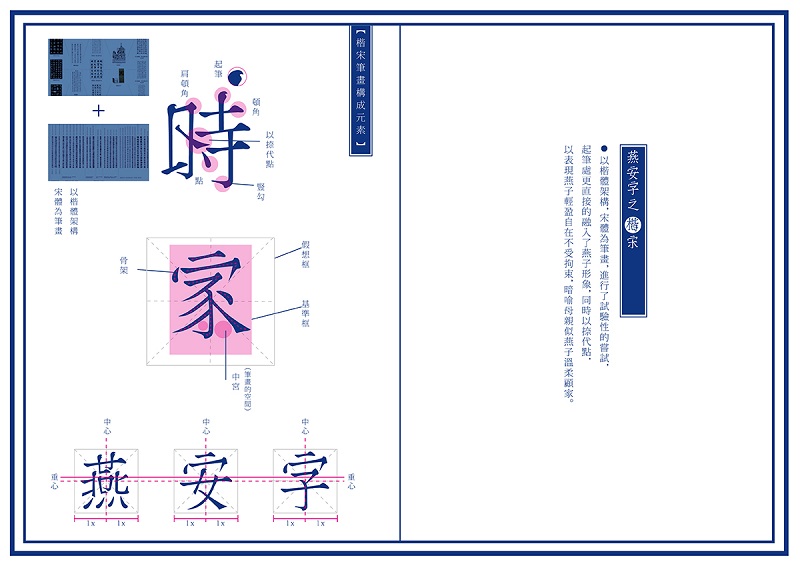 楷宋,以楷体架构,宋体为笔画,进行了试验性的尝试,起笔处更直接的融入了燕子形象,同时以捺代点,以表现燕子轻盈自在不受拘束,暗喻母亲似燕子温柔顾家。