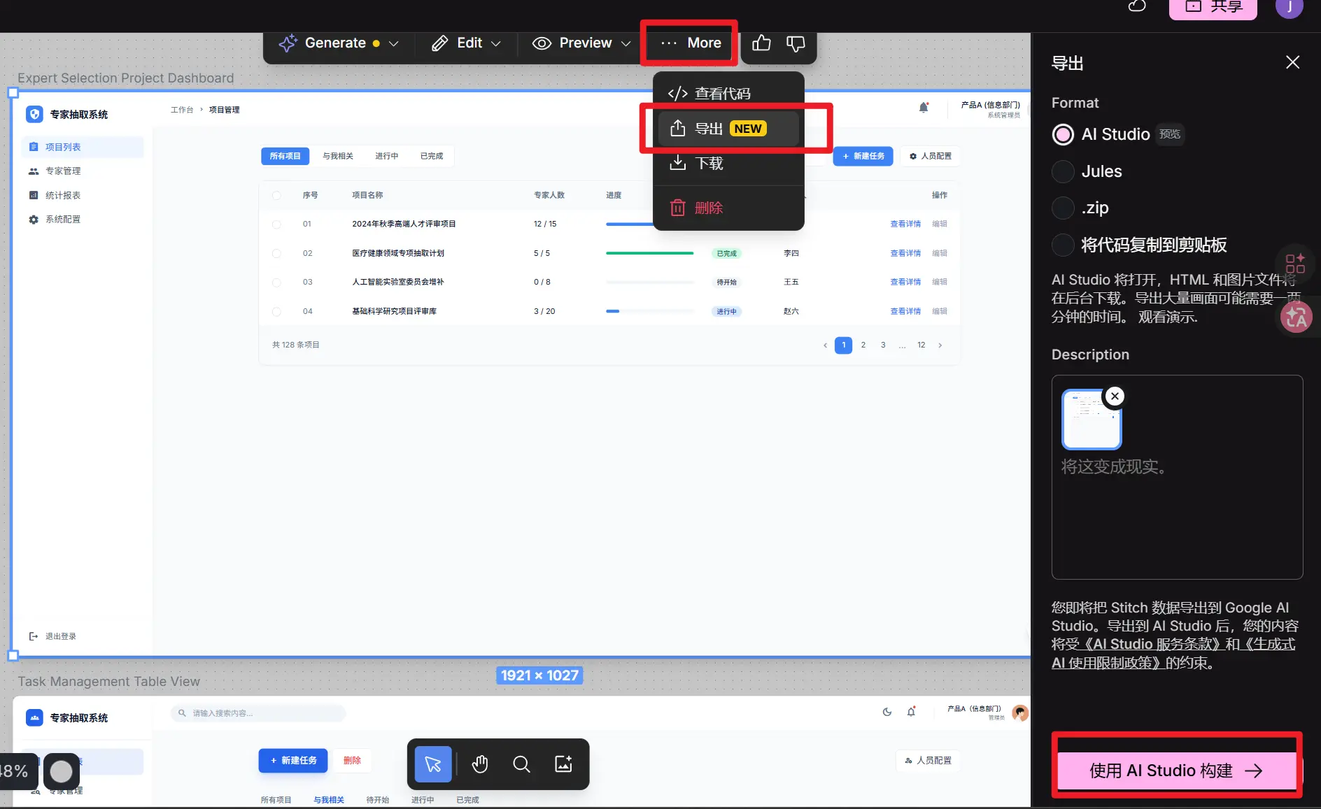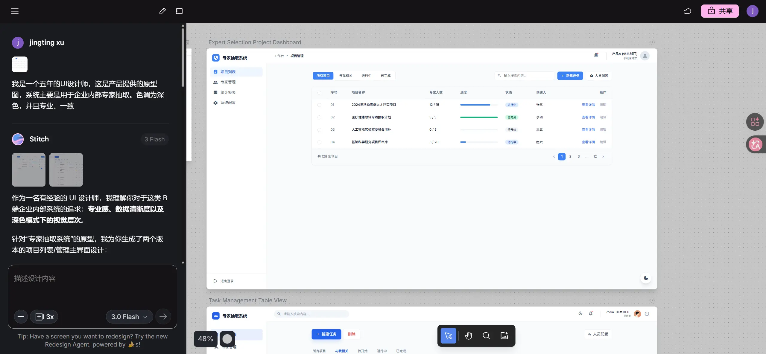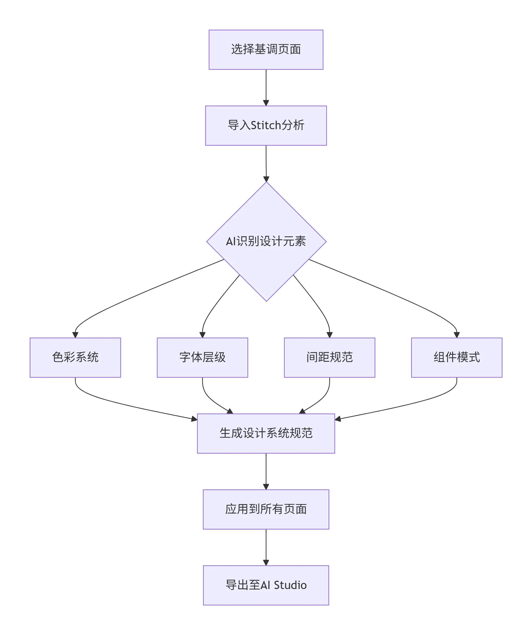 我选择一张最能代表产品风格的页面作为“基调原型”,导入Stitch。这个工具理解我的设计意图是通过视觉识别和智能分析。选择色彩系统、字体层级、间距规范——就像与一位理解力超强的UI设计师对话。