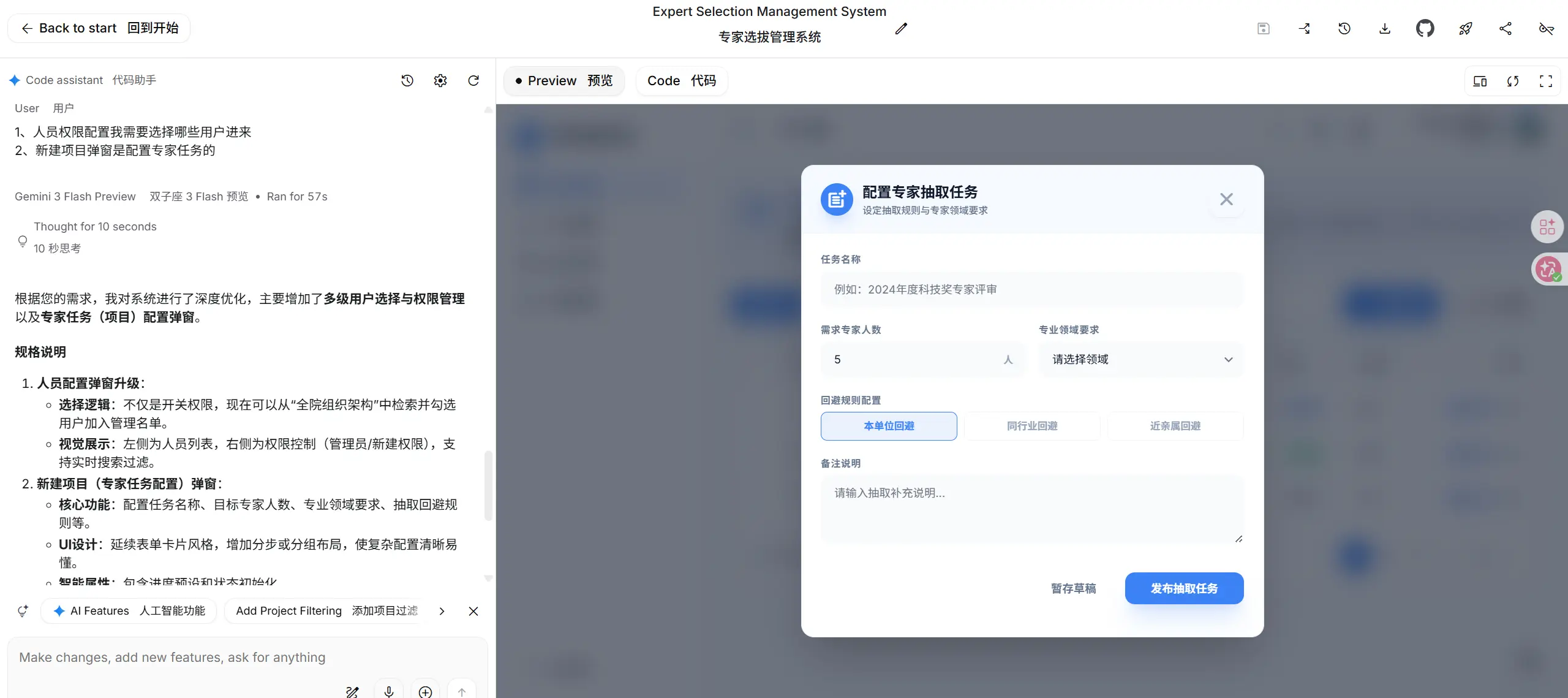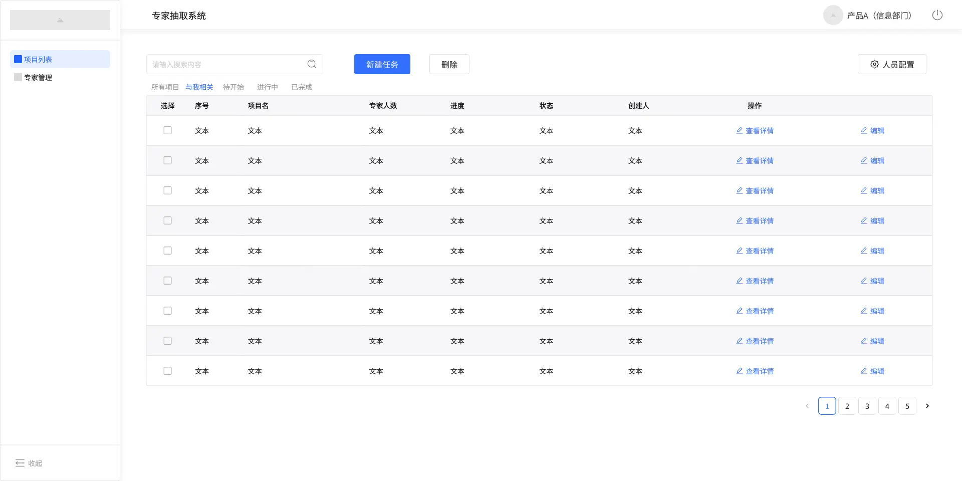 这里我以一个案例来进行演示。我想实现一个进行专家抽取的系统,用于对专家库内的专家根据一些筛选条件实现随机抽取,以确保公平性。这里我先通过原型设计软件实现了主界面的原型图绘制工作,包括基础结构、具体字段和大致样式。原型软件通过拖拉拽的方式可以在有了基本构想后,几分钟的时间完成此页面。