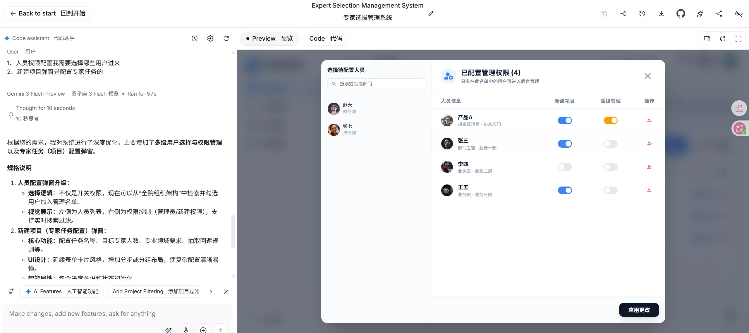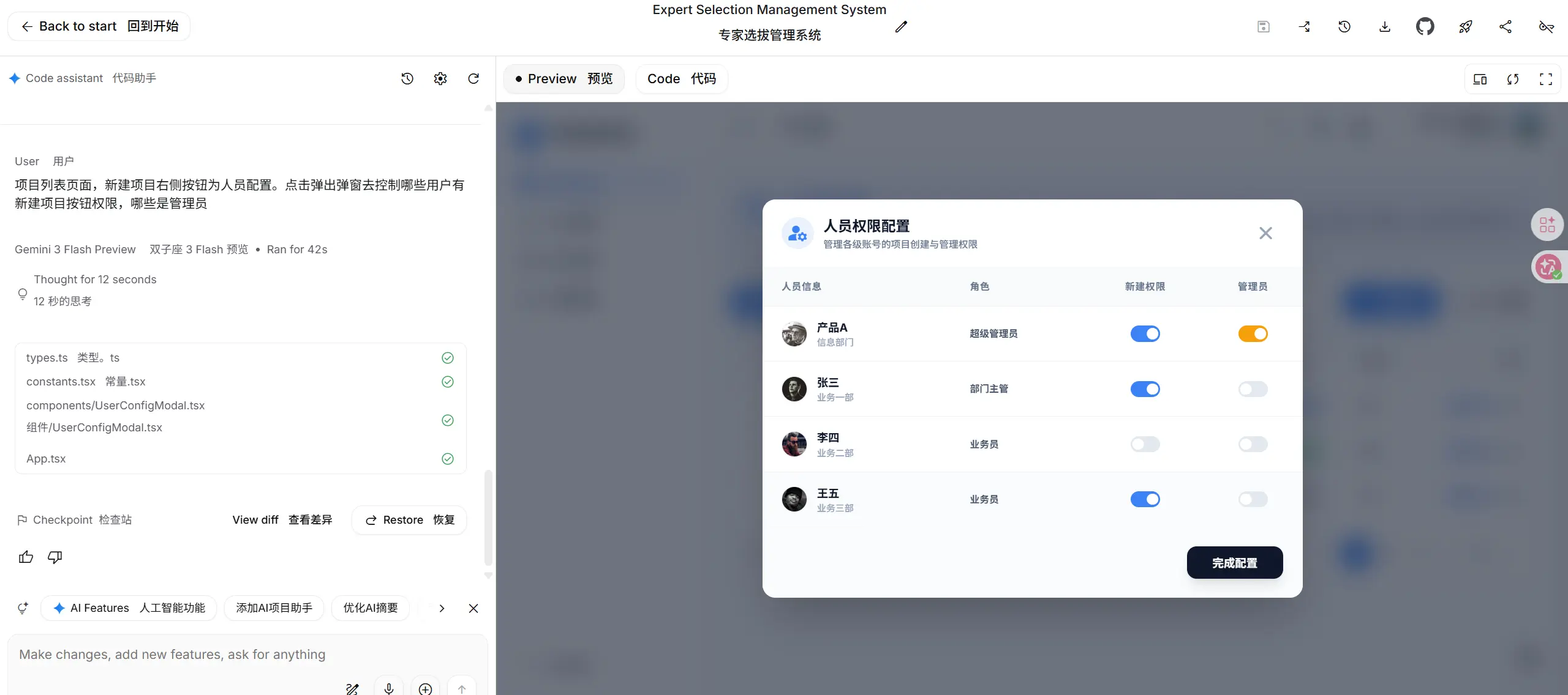 1、人员权限配置我需要选择哪些用户进来2、新建项目弹窗是配置专家任务的