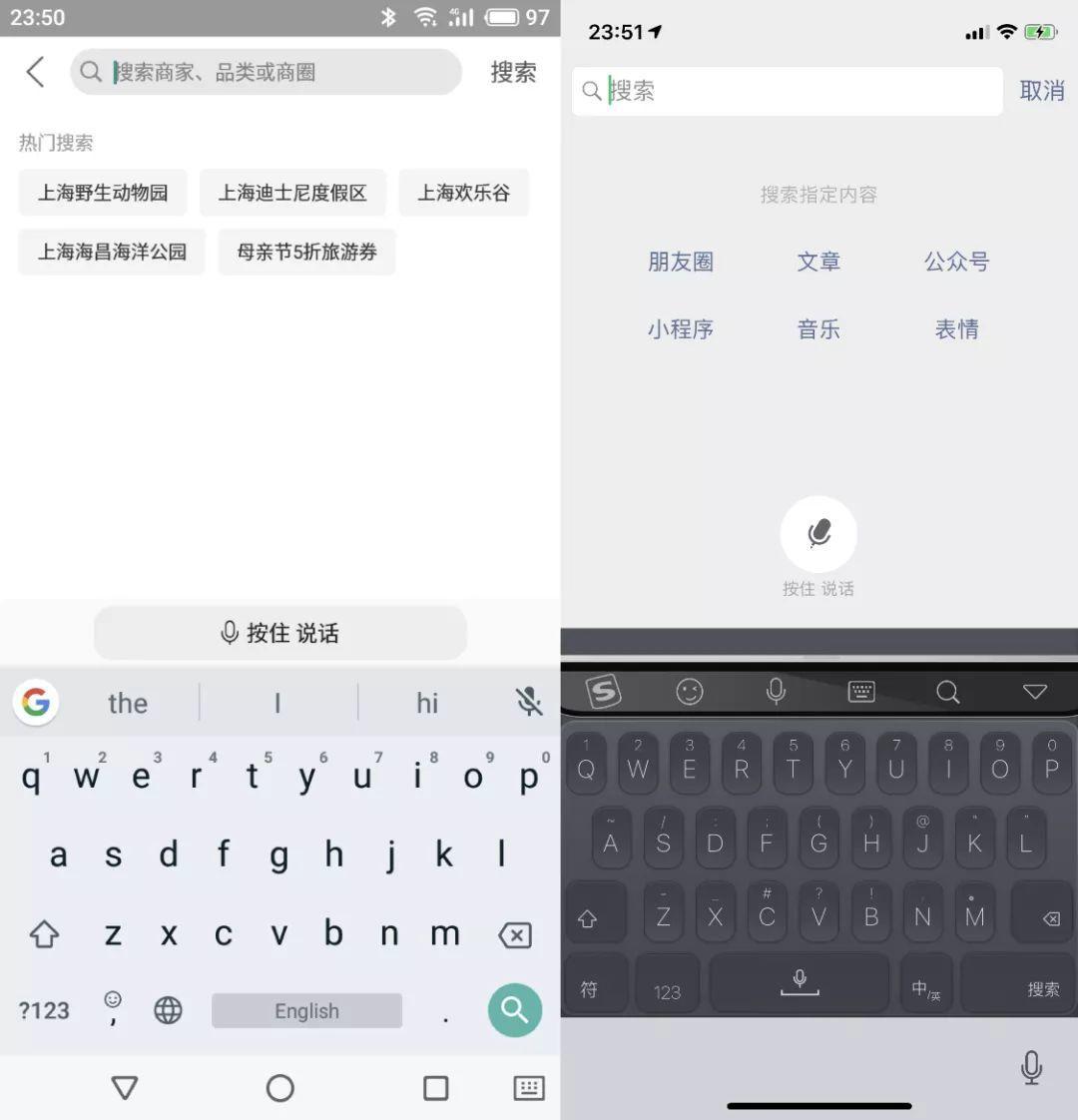 手动搜索的交互方式有多种交互方式,比如通过点击“搜索”按钮或软键盘的自定义 enter 键来执行。后者是 iOS 系统通用的交互方式,但 Android 某些系统版本原因,会提供键盘外的“搜索”按钮。