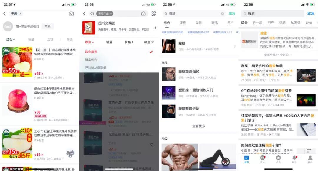 前者多用于搜索内容简单的场景,通常提供搜索关键词自动补齐,是一种轻量、简洁的方式。后者在许多 APP 上比较常见,主要是因为搜索内容复杂,需要有新的页面来承接结果和结果筛选等,而且通常搜索页面会用于展示搜索历史和热门搜索词。