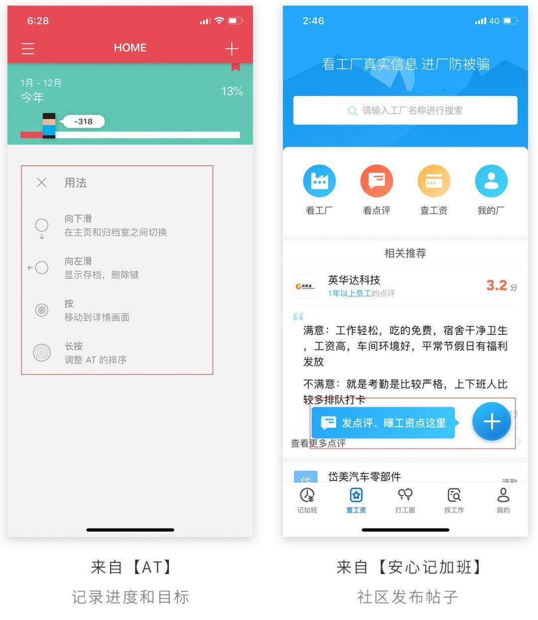 【安心记加班】在按钮旁做了引导,让用户明白此按钮是干嘛的,且能够给用户带来什么,直到用户点击一次后引导才消失。