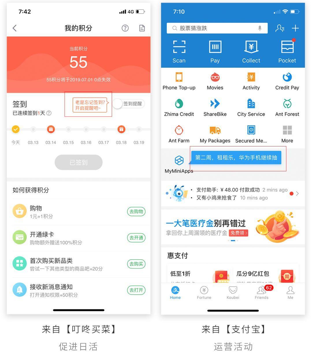 【叮咚买菜】用比较轻量级的引导提醒用户开启签到提醒,以此来提高产品的日活而【支付宝】则用轻量级的引导,为了提高活动的参与度,提醒用户有新的活动可参加。