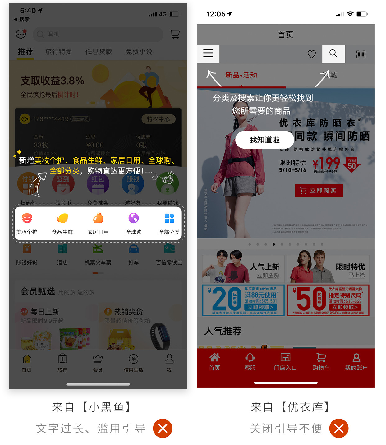 【优衣库】的引导用的恰当,但是交互却不是很方便,必须要点击“我知道啦”才能关闭引导,对于用户并不是那么友好,如改为点击屏幕任意区域关闭引导更为合适。