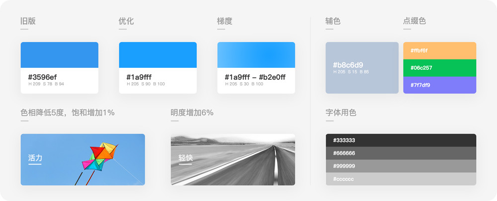 新主色在原有的基础上,选择了HSB模式进行优化,也便于团队迭代管理。渐变的使用使页面更加有活力,增加视觉焦点。