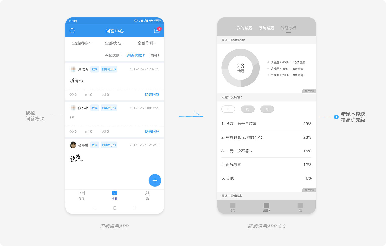 还原真实的做题场景,砍掉了问答功能,提高错题本的优先级。我们希望同学们是独立自主的完成作业,举一反三,不依赖第三方的答案。