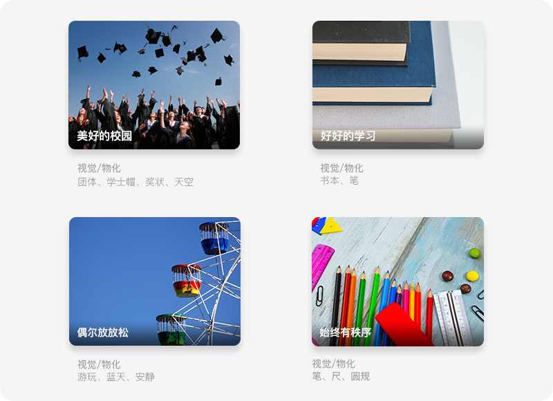 通过在试点校园进行用户调研,运用产品关键词搜索出符合设计感受的图片,通过给予用户(学生、老师)筛选,确定视觉感受的搭建及设计调性,最终提炼输出:风格统一、微质感、多彩、插画,4个视觉属性。