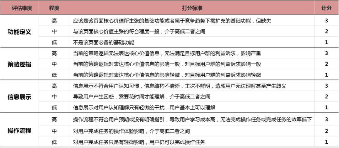 为了让各个维度的评估更有据可依,我们又分别给这四个细分维度建立了更具体的打分标准,进一步减小误差,如下表所示。