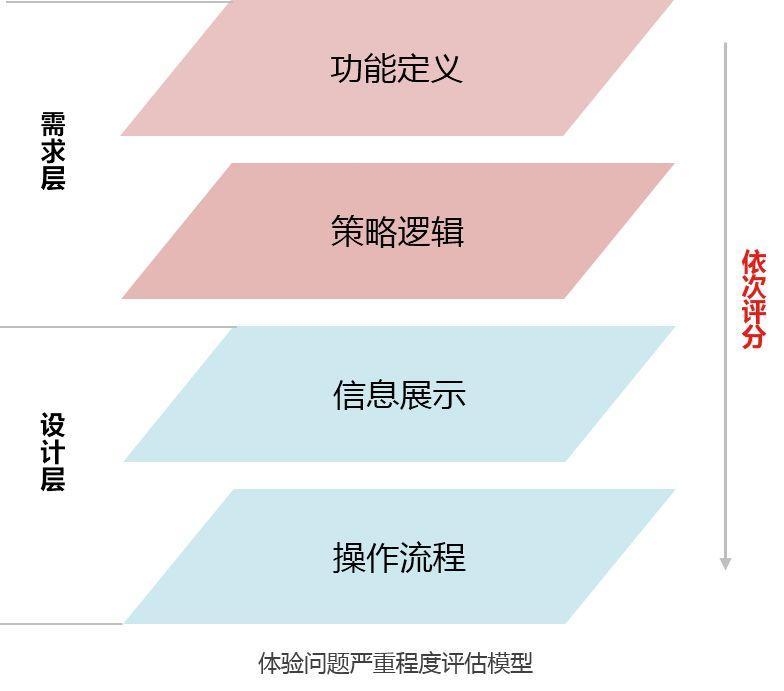 我们对体验问题的“严重程度”进行打分时,可以从需求到设计逐层评估,并且按顺序 依次评分 ,只对存在问题的维度评分, 且多个维度都有评分时,只计最高分。