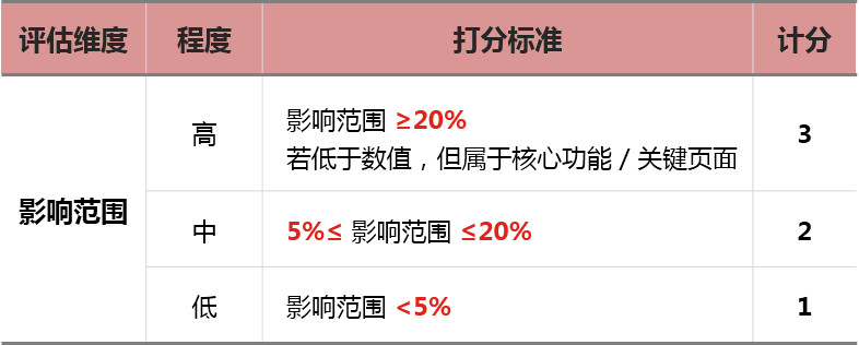 影响范围是一个相对可以量化的指标,可以通过该问题可能影响的用户数占问题所属页面总体用户数的大致比重来评估,并且按照百分比的边界值进行1/2/3分的赋值,占比越高,分值越高。(PS:在实际使用的过程中,百分比的边界值可根据自己产品的实际情况进行调整)
