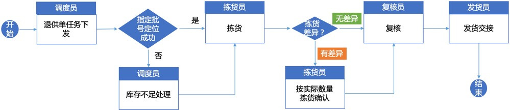 - 退供单由上游采购系统下达WMS库房后,库房调度员根据退供单中指定的批号下发任务;退供应商一般允许缺量发货,若下发过程中发现指定批号库存不足,可修改下发数量,按照实际批号数量出库。