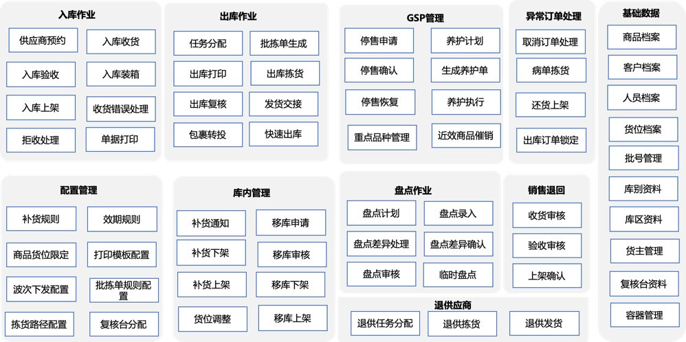 根据以上规划,一个典型医药WMS的常规核心系统功能展示如下: