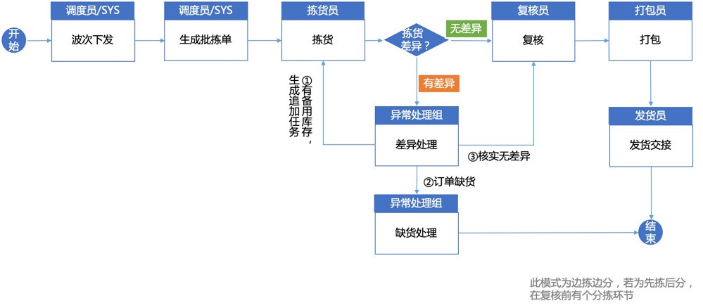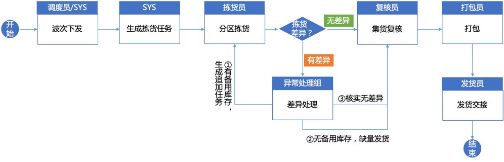 4)拣货过程中若无差异,分拣完成后即可进入复核打包环节,若有拣货差异(如账实不符),需要异常处理组介入,对订单进行差异处理,差异处理主要有三种结果: