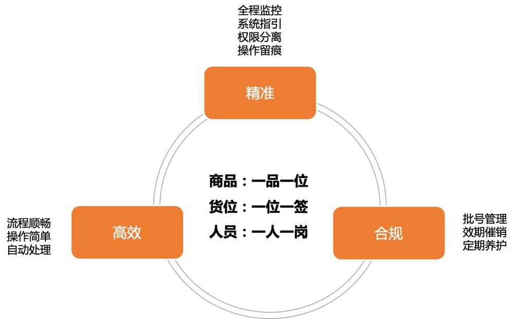 - 合规 :这一点在药品行业尤为重要,所有的操作必须符合GSP法规要求。如批号管理、效期催销、定期养护等。