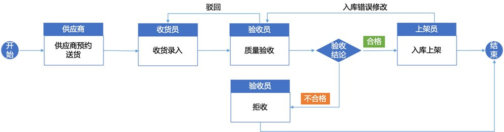 - 验收员提取已保存的收货单,打印验收单(或直接在PDA或收货台车显示屏上)对到货商品进行验收,验收为合格的商品可进入库房指定区域上架,若不合格,进行拒收处理;若发现验收数据因收货员录入错误,可驳回至对应收货员重新录入修正数据。