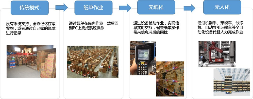 我个人把库房的发展按照作业模式,划分为4大阶段: