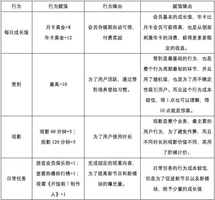 把这些用户行为进行归类——哪些是成长性行为(只能获得一次成长值的行为,例如:添加头像,促进用户成长)?哪些是日常行为(观看视频,促进活跃)?很多价值过小的行为也需要过滤,得到极具价值的行为列表。然后给不同行为赋予不同的成长值,用户的行为背后成本的付出,行为完成后给平台带来价值,所以具体赋值与这两个维度有关。通常规则是成长性行为的数值大于日常行为的数值。