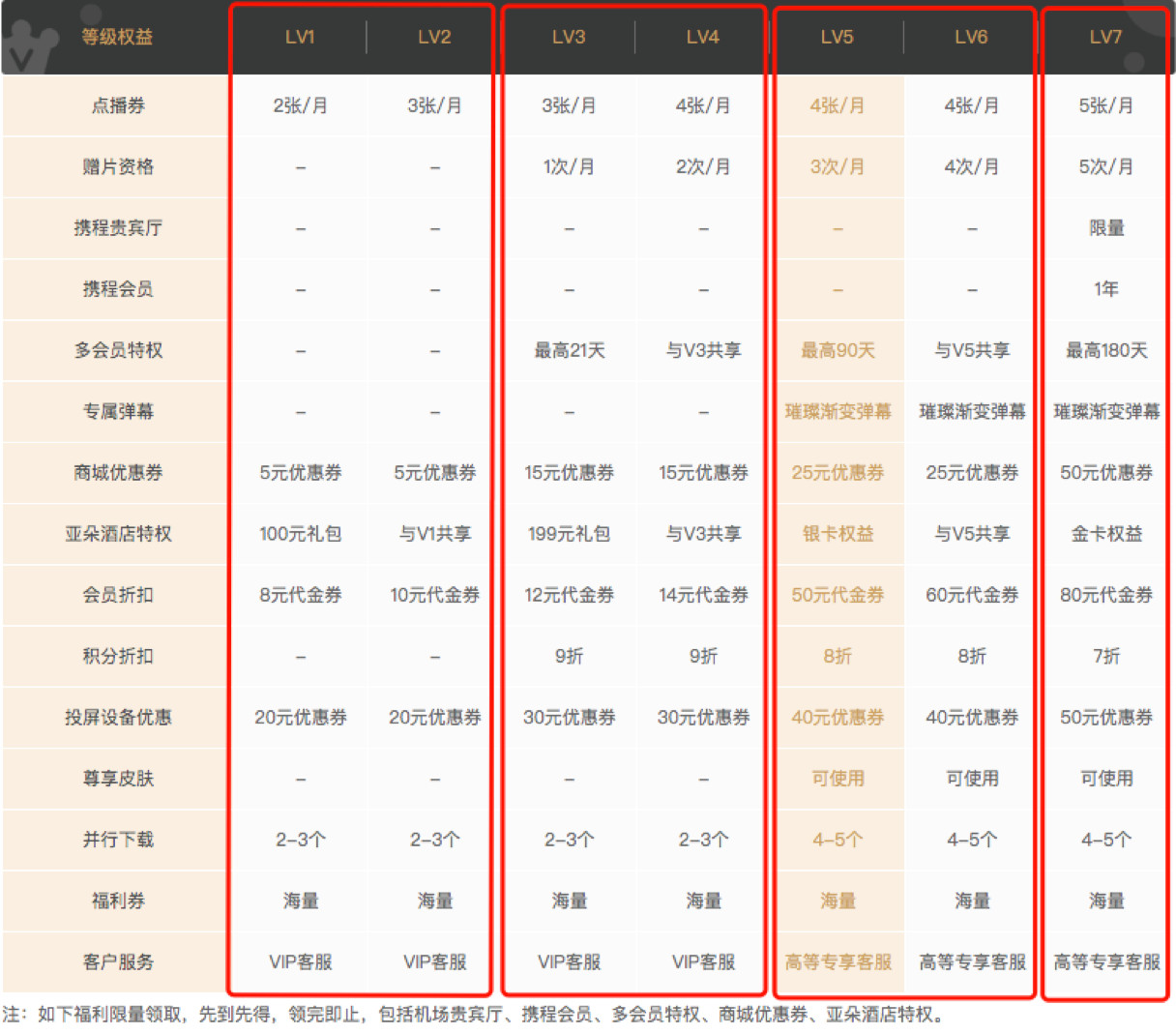 - 等级权益:阶梯权益明显,并且可以看出7级等级大致分为四类(如下图),单类权益相同,权益大小不同,也从侧面体现了开始谈到的最基本的四级会员的细化。
