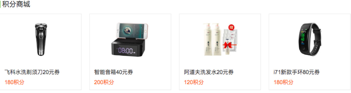 汇率:目前积分没有和人民币形成统一的汇率,是优惠券定价制,所以出现了80、120、180都有兑20元券的情况。这也是一个问题,让用户对于积分没有具体的价值概念。