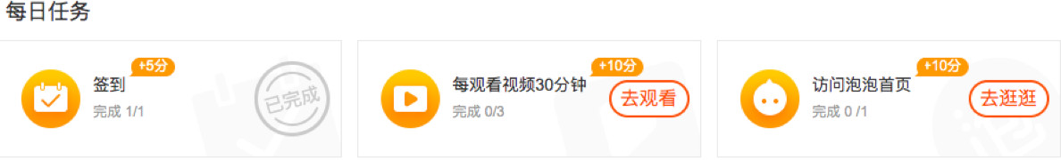 相比于等级成长体系,激励体系就做得少一些。积分的获取比较单一,并且和成长值的获取重合度极高,签到、观看视频、访问泡泡首页,挂扣的行为和成长值类似,就不做具体分析了。但是,这里的行为还可以增加,譬如影评、分享视频等等,与成长值的获取差异化。