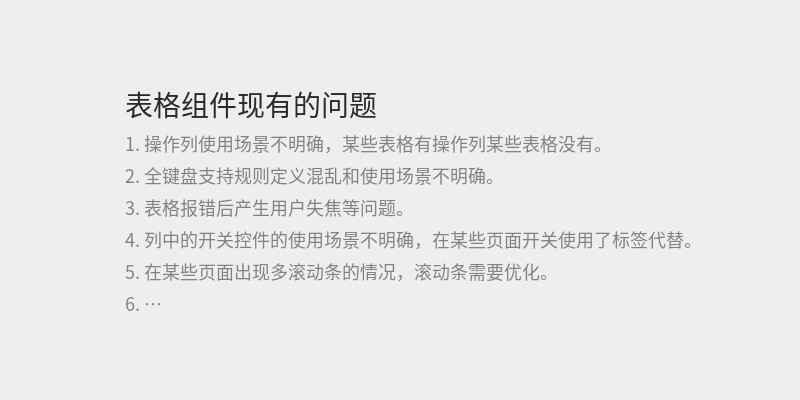 发现问题解决问题是设计的基本思路,图1罗列了部分我们产品中表格组件的现有问题。但是直接针对问题点进行优化可能会有更多的问题: