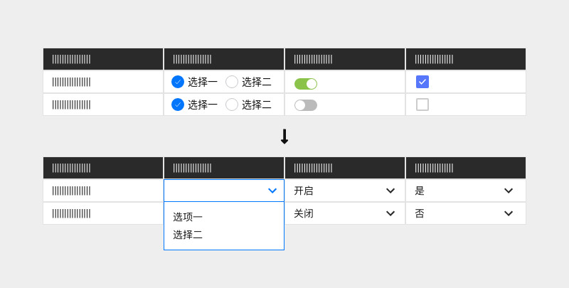 • 降低表格内的输入控件类别,让用户使用同样的操作逻辑进行录入。例如,单选控件可能会打断用户的全键盘操作(必须用鼠标点击),可将单选改为下拉,用户可以通过↑↓键进行选择,操作流将不会被打断,图3。