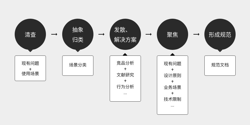 • 第二步,将梳理出的组件抽象化并按场景归类,归类的目的在于让组件的优化具有通用性和一致性,而不是针对个别页面的个别优化。而且能让我们分析出该场景下用户的行为模式,由此推导出解决方案。