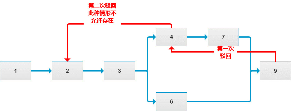 节点4此时也不支持再次使用按流程图执行的驳回,因为是会破坏节点9的设置期望,节点9是期望驳回后直接处理返回回来,所以“直接提交给我”驳回后,统一规则为不允许再次驳回。只能是按节点9的期望处理完后再次返回给节点9.有驳回权限的节点