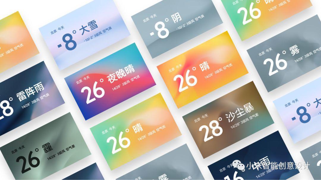 大多数APP的天气背景分三种:纯色、风景图片、扁平插画。我们想探索不一样的视觉方式,展现更多的吸引力。在抽象与具象中获得平衡,颜色是抽象的,黄色是阳光,蓝色是雨,白色是雪,但颜色变化和流动的韵律又是具象的,平缓的横向变化是安静的雪晨,红色黄色的拥挤像热的透不过气的夏天,卷涌的咖啡色和灰绿是呼啸的沙尘暴。