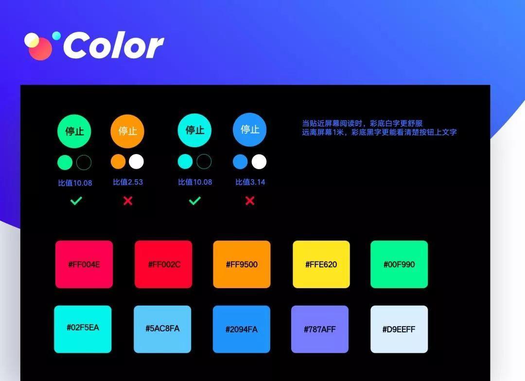手机APP的常用控件为彩色底+白字,比值在1.5-3.54的区间,近距离观看柔和不刺眼,但为了增强识别性,音箱的控件是彩底黑字,比值区间在5.25-16.59。颜色比值计算 https://contrast-ratio.com