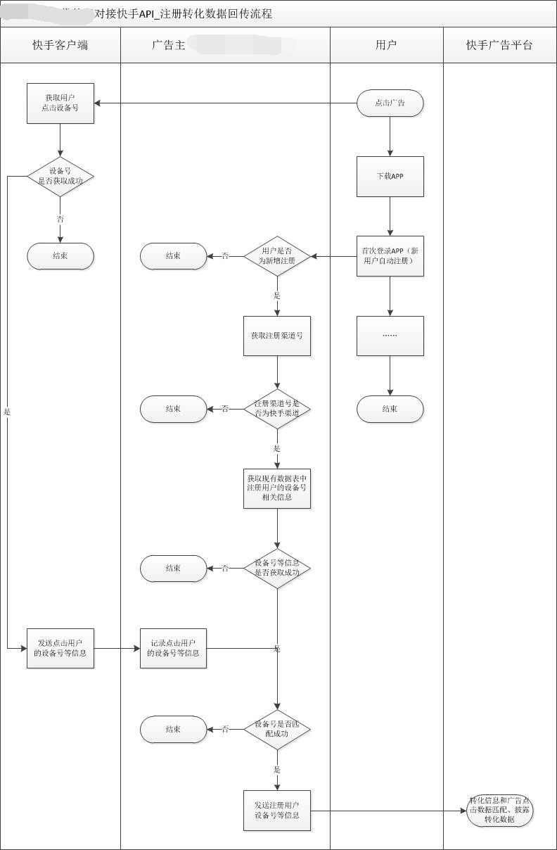 作为广告主, 、 *对接快手API的流程分为 记录点击用户的设备号相关信息 、 新增注册用户判断 、 获取注册用户的设备号相关信息 、 设备号匹配 、 发送注册用户的设备号相关信息 5个环节。
