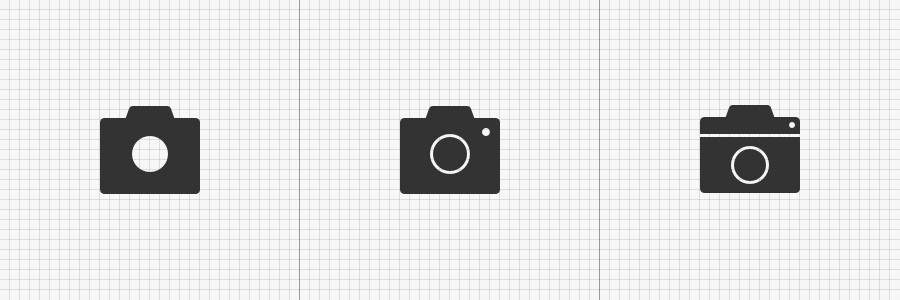 设计面形图标时,对于多余细节的管理也很重要。随着细节的增加,块面切割过多,会使得整体图标变得过于零碎(如下右图)。保持简约的设计提高图标的识别度,在关键的特征细节上做补充(如下中间图的相机闪光灯点)。