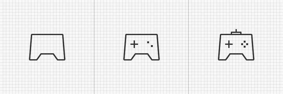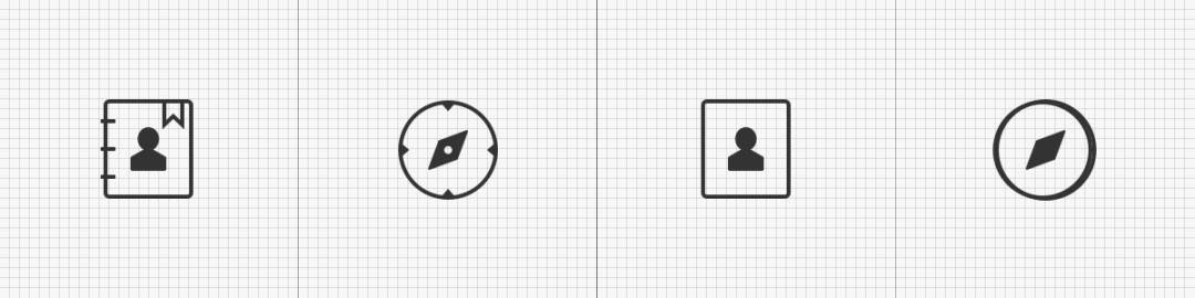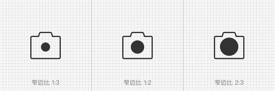 当内形为外形的1:2时(下图2),图标的整体视觉效果较为平衡;当大于1:2并接近4:3时,图标内部结构会显得过于饱满;而小于1:2并接近4:1时(下图3)则会产生稀疏不紧凑的效果。(这里的比例只是案例需要,实际设计以最终的视觉感知为准)