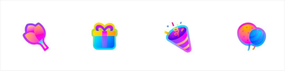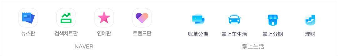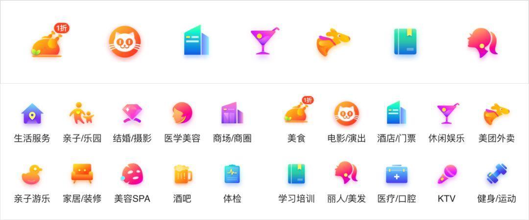 整体风格偏向轻写实+微弱渐变。每个图标都具有丰富的细节表达,色调方面基于业务属性结合品牌色进行了区分,整体既统一又具有差异化。