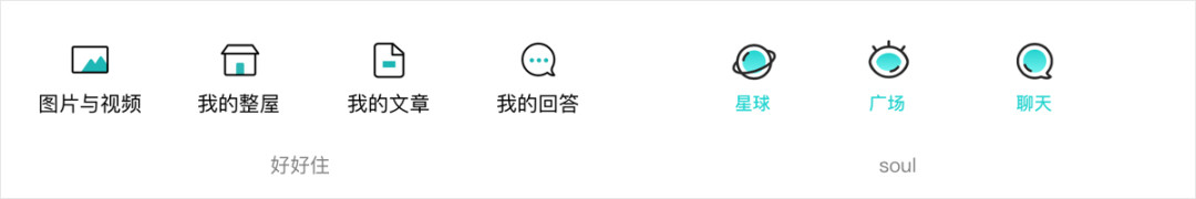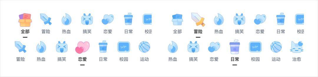 图标风格偏向卡通插画,选中态与默认态的设计较为巧妙。