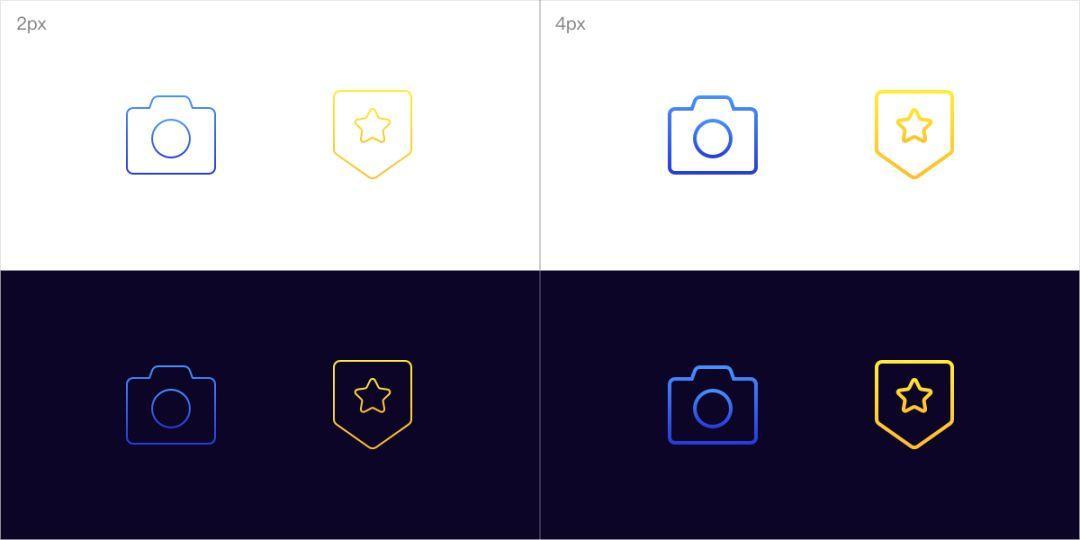 结合渐变的颜色,丰富了整个图标的视觉表达,并提升了图标的视觉冲击力和设计感。案例结合黑白背景作为尝试,白底:粗线比细线的视觉效果相对较好,渐变也能较为清晰的被表达,黑底:细线比粗线的视觉效果显示得更加精致和具有锐度感。