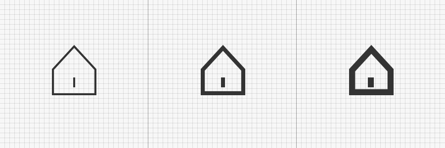 线面比例的差异,图形呈现出来的张力也会又不同的感受。基于中间填充的图标形态尝试了三种不同的比例,从下图中可以看出,当填充与外形窄边比为1:3时(左图)图标呈现往内收的感觉,填充与外形窄边比为1:2时(中间)图标整体较为平衡,当填充与外形窄边比为2:3(大于1:2)时(右图)整体具有外扩趋势。