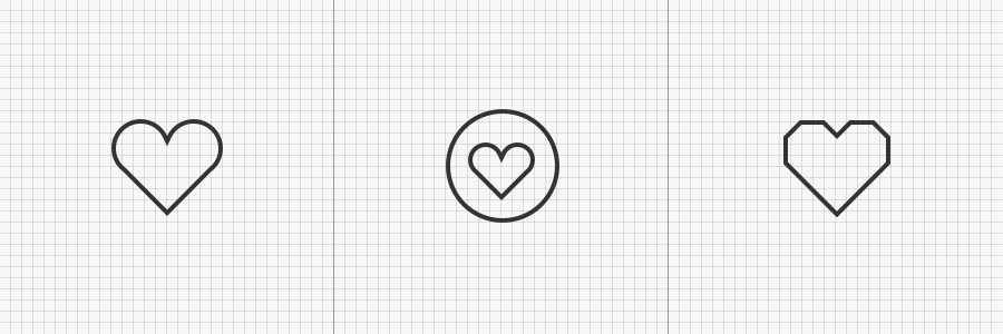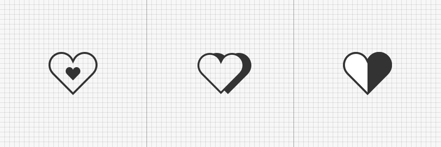 如下面的“心形”图标,下左图为我们具有普识性的图标,与圆形组合之后依然保持着原有的形态美感。但我们不时也会看到第三种设计,整体外形虽然保持着爱心,但为了与整体风格“一致”强行对外轮廓进行切割,与原图形在美感上则稍微有些出入,这也是我们需要思考的关键点。