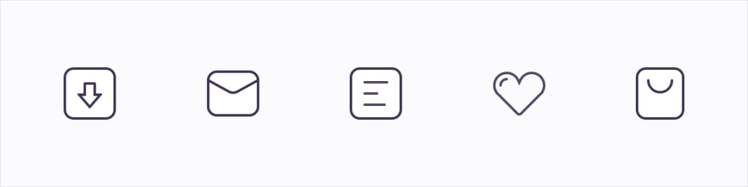 此类图标在视觉表达上具有较高的线性流畅度和设计感,关注点在于整组的图标的 “开口起始点” 设定上需保持一致。例如:“从左到右”或“从右到左”形成一体化的连贯线条,开口起始点不一致会影响整组图标的一致性,应用在页面时也会显得杂乱。