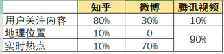 (2) 在推送内容上,知乎、微博、腾讯视频均会基于用户标签进行推送,但侧重点又各不相同。