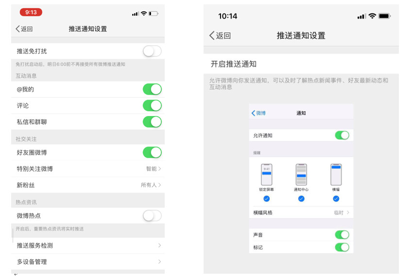 当用户在系统中设置关闭通知后,是无法接收到通知推送的,所以当用户进入【推送设置】时,微博增加了一个教用户开启通知的动图教程,引导用户打开系统通知设置,并告知用户打开通知后可收到的内容有哪些,相当于为用户提供了打开通知的理由。