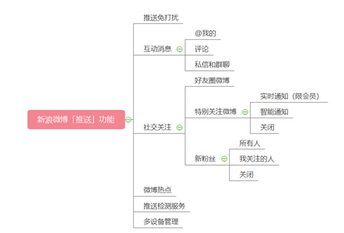 微博的「推送」功能总共分为6个部分,对用户进行推送的分别是互动消息、社交关注和微博热点。