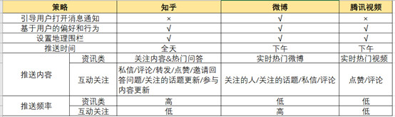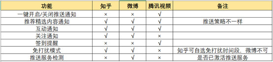 根据以上对知乎、微博、腾讯视频的推送功能拆解,总结出下表,对三者的推送功能进行对比: