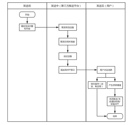 首先,PUSH发送的流程如下图所示(以Android、使用第三方推送平台为例),当推送内容开始发送时,流程中的每一步都会存在数据流失,因此我们需要关注这些数据,并了解每个层级间的转化率。
