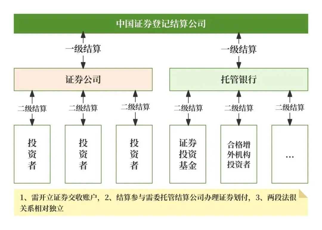 结算参与人:具备中国结算直接进行清算交收资格的机构,主要是券商,同时券商要在中国结算开立的、专门用于交易资金交收的专用资金账户,券商需在此账户预留足够资金【结算备付金】。国内是采用分级结算模式,如下图所示: