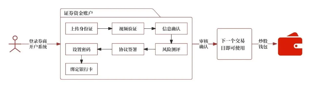 交易账户是投资者在券商、基金、期货公司开立的、用于记载其持有股票、基金份额、期货合约、债券等品种、数量、变更情况的账户。这里就不详细介绍证券交易、基金交易和期货交易账户。交易和资金账户的开户流程一致,均是同步一起开出来的,如上图所示。