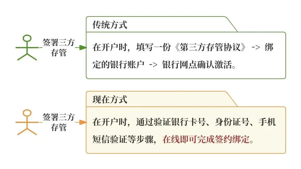 投资者在券商、期货公司等开立的账户时、需要绑定银行卡,这步即签署第三方存管。商业银行作为独立第三方,存管投资者的交易结算资金,负责资金清算交收的业务模式。证券/基金/期货公司管股票、基金份额、期货合约,银行管资金,实现资金与证券的分离。