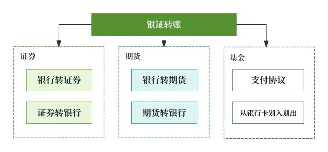 现已在券商、期货、基金公司等开好账户、且已签署好第三方存管,万事俱备,就差东风:银证转账。银证转账又分为,如下图所示。